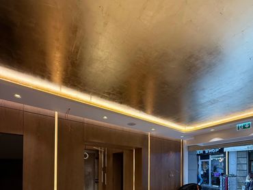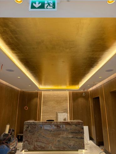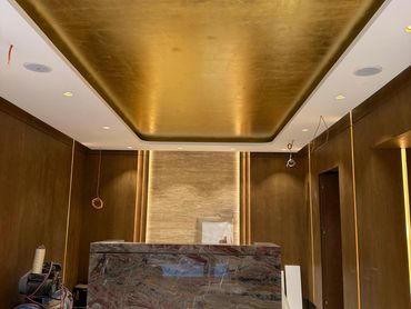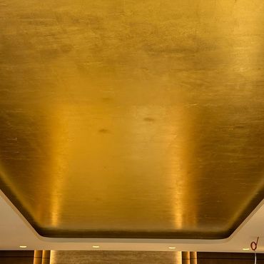 Tavan uygulamasında her detay, ustalıkla ve incelikle işlendi. Altınvarak kaplama işlemi; yüksek kaliteli malzemelerle, profesyonel el işçiliğiyle uygulandı. Tüm yüzeyin bütünlüğü korunarak tasarlanan desenler, klasik dekorasyon anlayışına sanatsal bir yorum kattı. Bu sayede hem tarihi dokuya saygı gösterildi hem de modern bir lüks hissi yaratıldı.